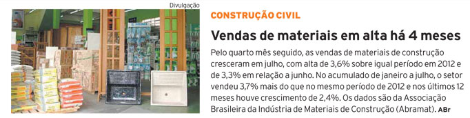 | QUARTA-FEIRA, 21 DE AGOSTO DE 2013 | 16:28 |  |  |  | Construção civil - Vendas de materiais em alta há 4 meses |  |  |  |