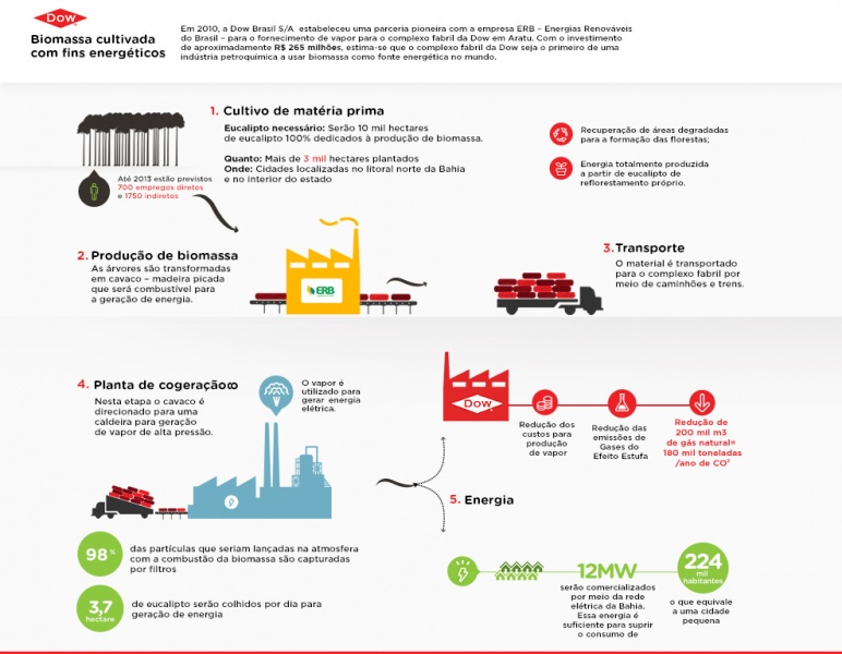 No projeto, a EBR investiu R$ 265 milhões na construção da unidade de cogeração de vapor e energia elétrica no complexo fabril de Aratu, a maior instalação da Dow no Brasil. A Dow, por sua vez, fechou um contrato de 20 anos para a compra da energia gerada por meio do vapor da biomassa.