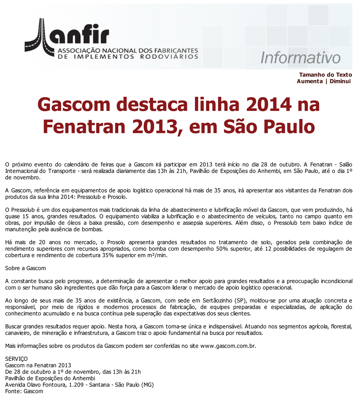 Participação da Gascom na Fenatran 2013 é destaque no Informativo Anfir