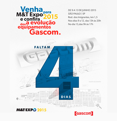 | SEGUNDA-FEIRA, 08 DE JUNHO DE 2015 | 08:18 |  |  |  | Aguarde, faltam apenas 4 dias. |  |  |  | Em 2015 a M&T EXPO, Feira Internacional de Equipamentos para Mineração e Construção, completa 20 anos. Para comemorar este sucesso a Gascom estará levando para a Feira várias novidades inovadoras para o setor. Aguarde, faltam apenas 4 dias.